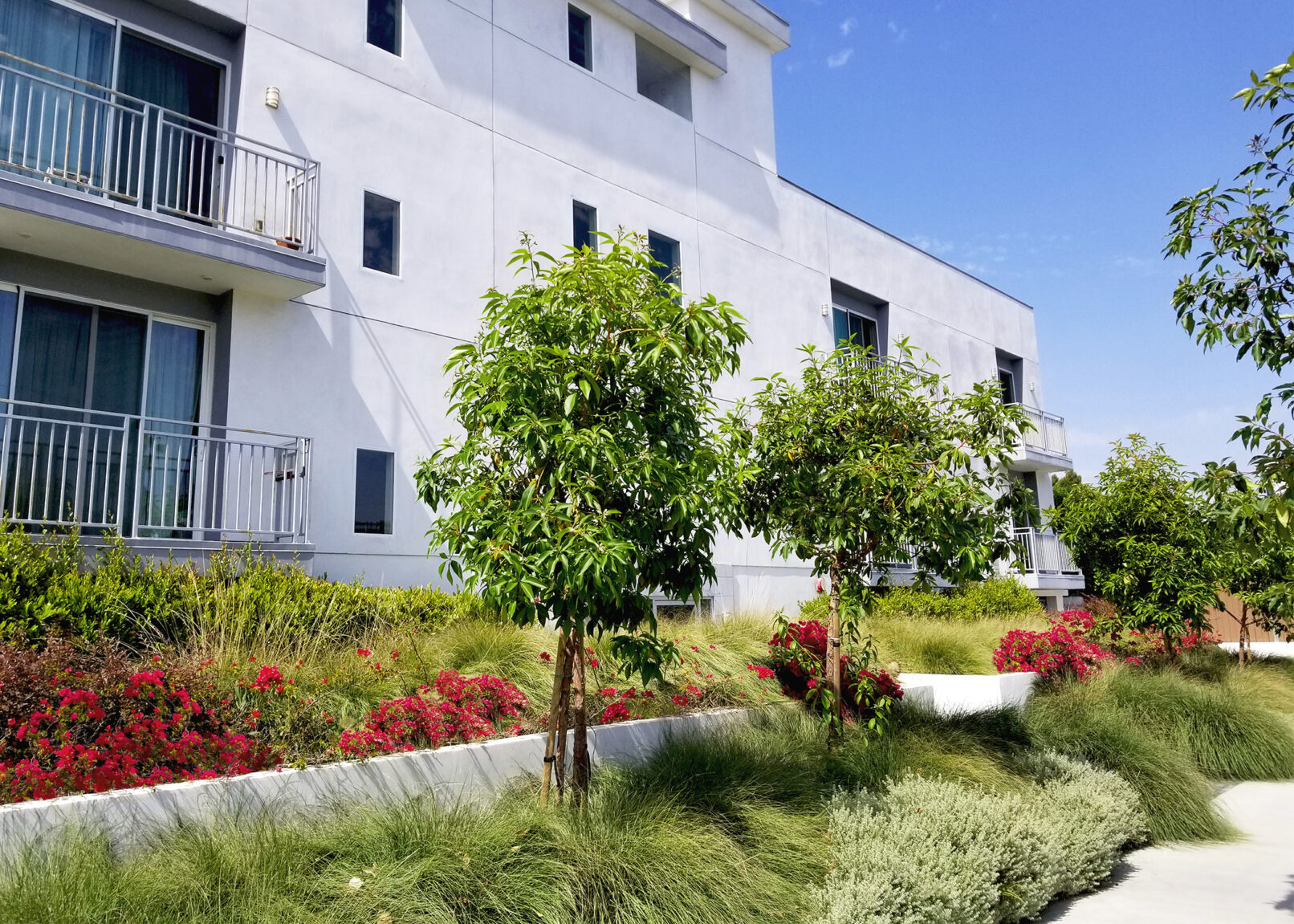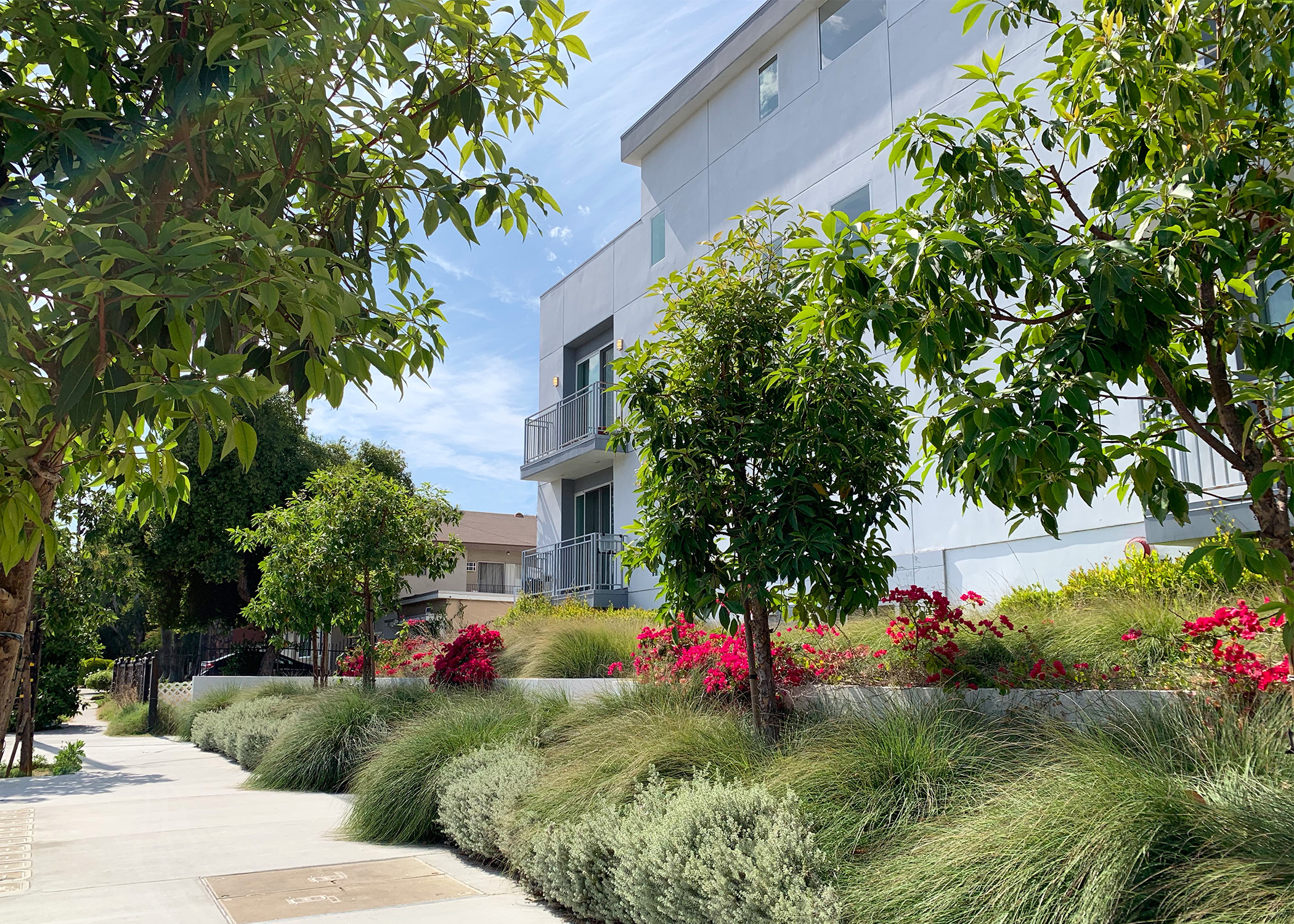This multi‑family residential project in Van Nuys blends modern living with sustainable landscape design. We used ornamental grasses and other drought‑tolerant plantings to support water conservation while keeping the outdoor spaces vibrant and inviting.