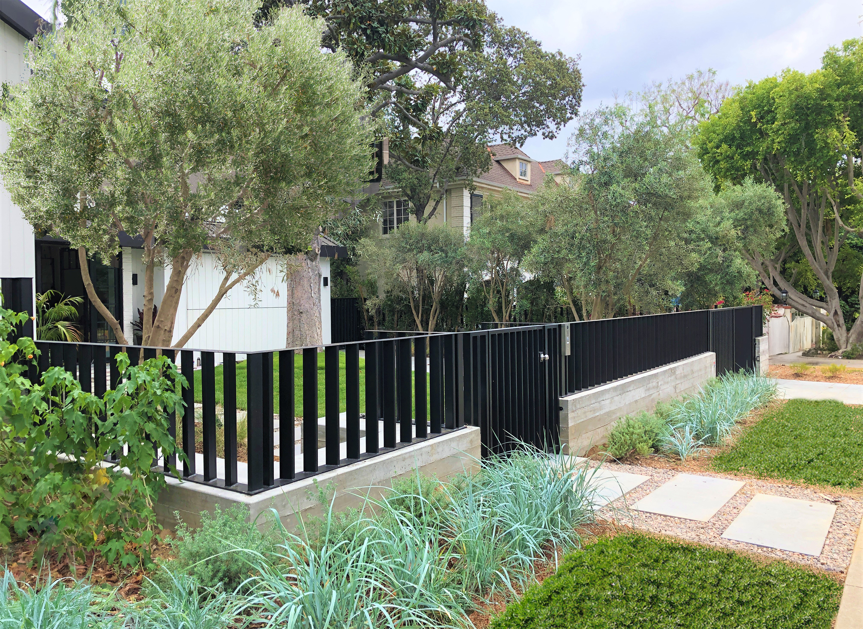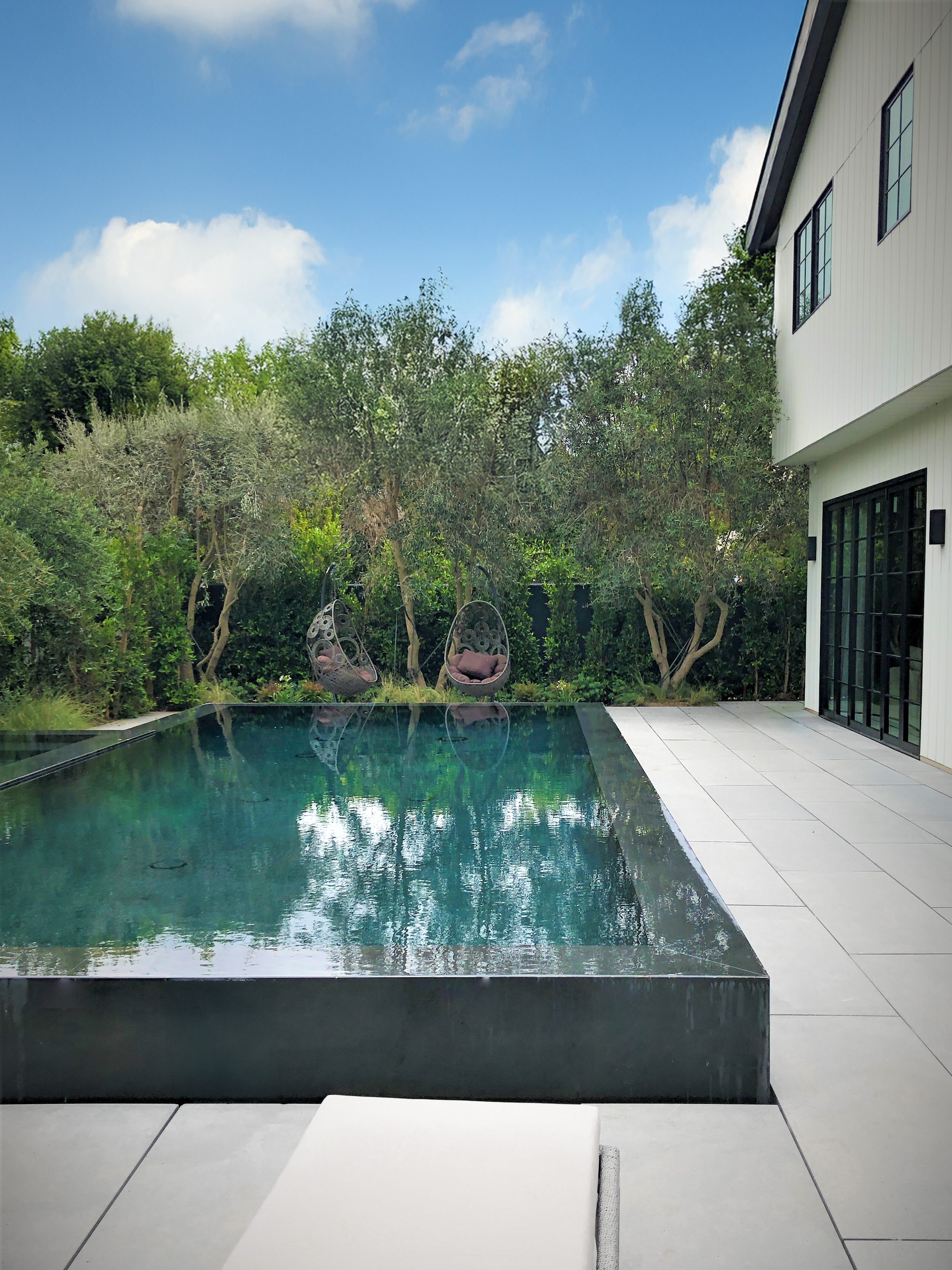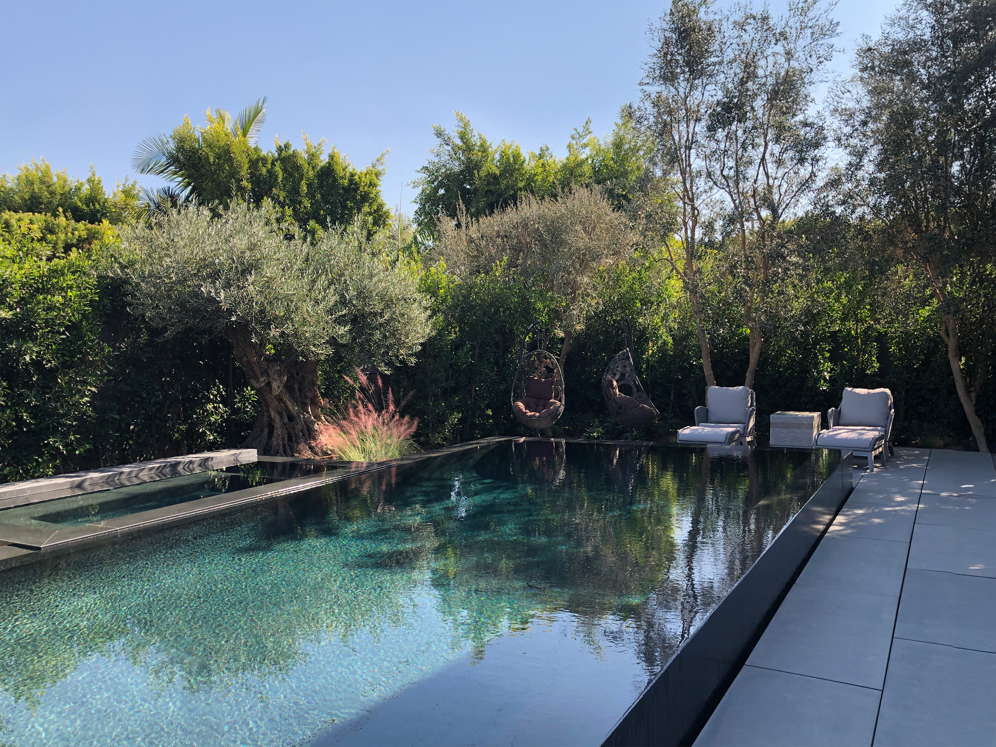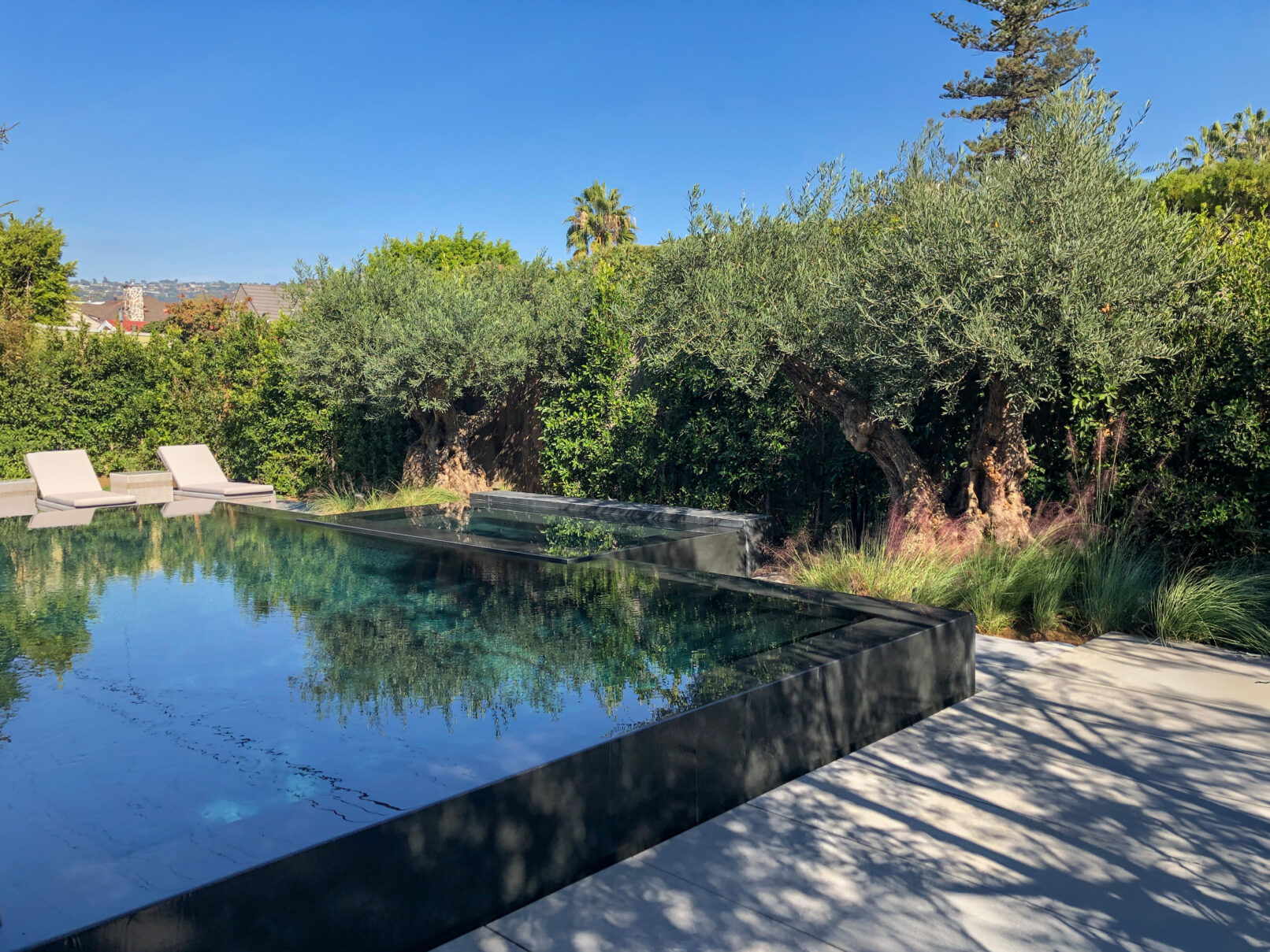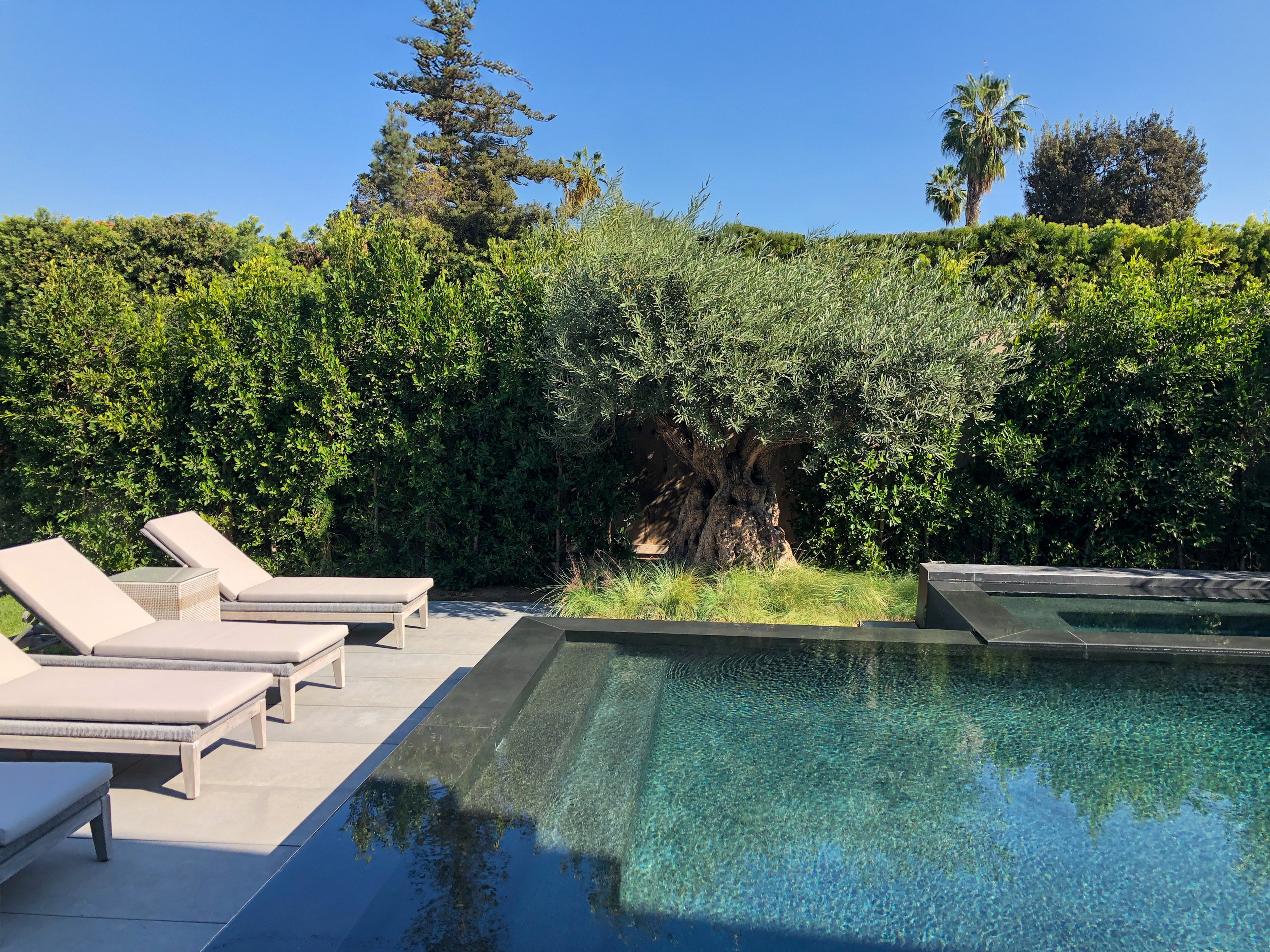 Located in Beverly Hills, this property blends contemporary architecture with natural elegance. The landscape is anchored by olive trees as their sculptural forms cast soft shadows over ornamental grasses. Each element, from the sleek stone pathways to the serene poolside, creates a modern sanctuary.