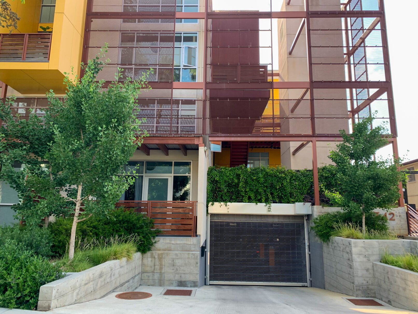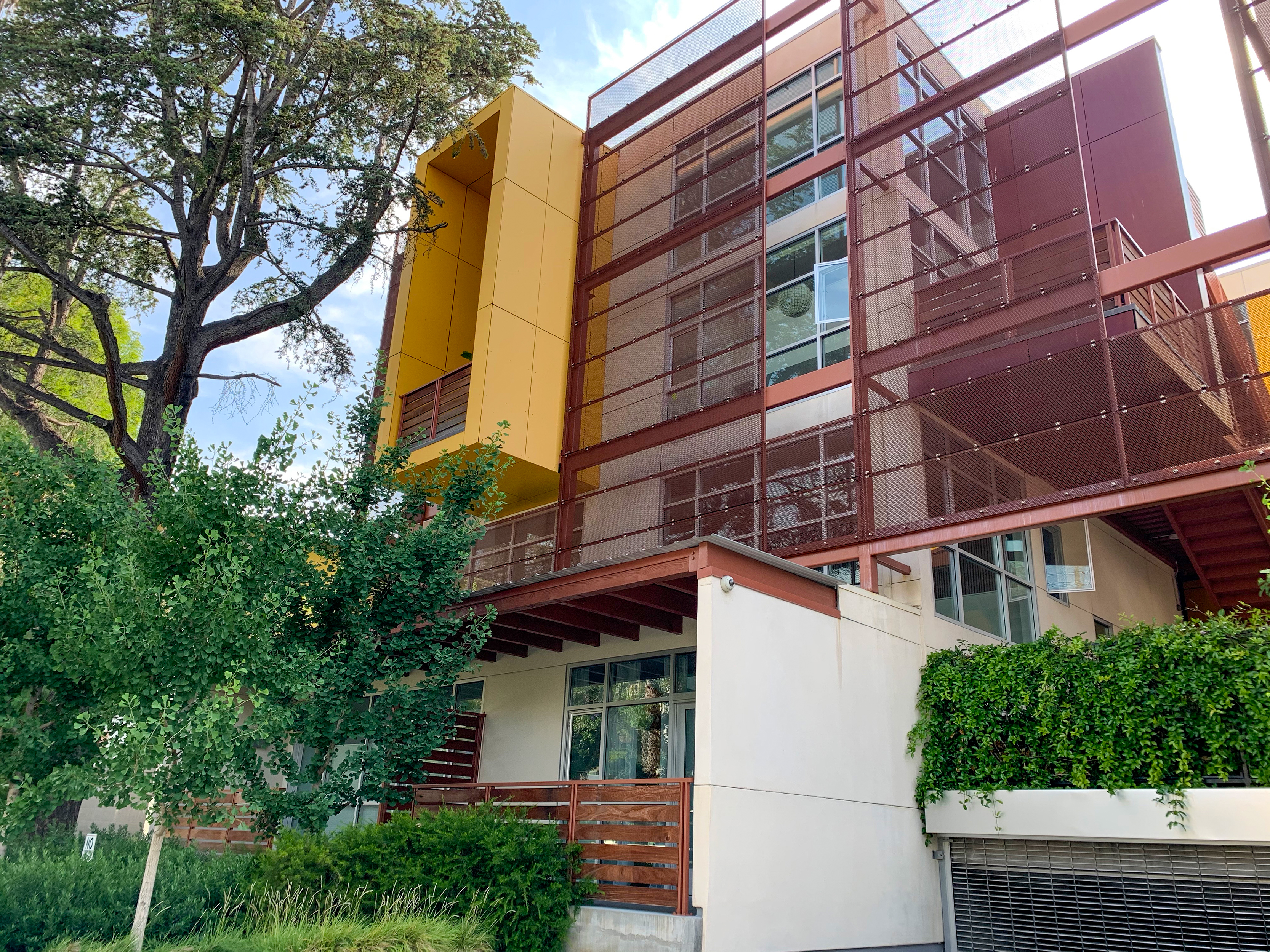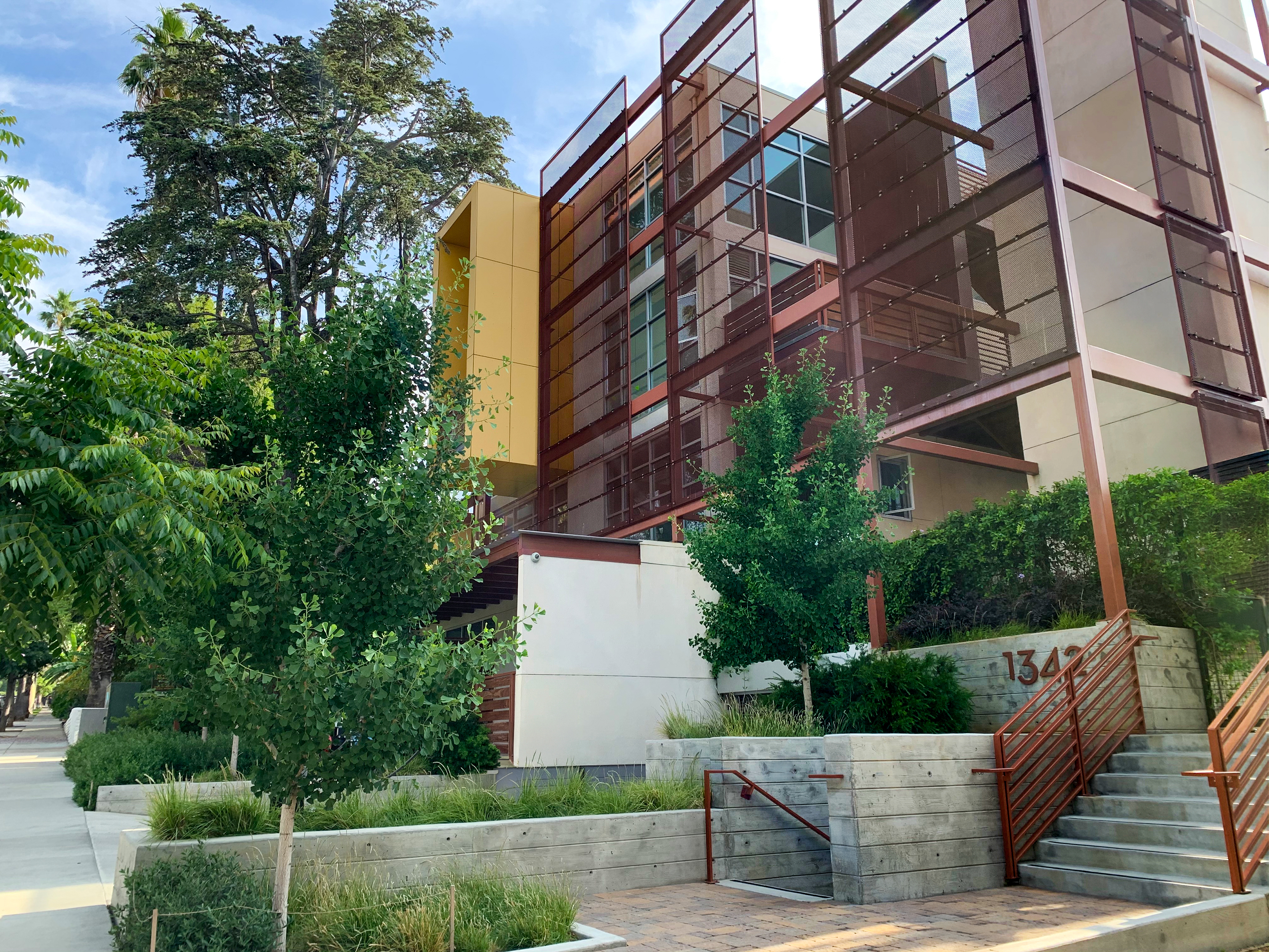 Hayworth Townhomes, located in vibrant urban West Hollywood, offers 16 beautifully designed residences. Lush landscaping with a variety of plants, grasses, and trees creates a striking contrast against the pops of yellow and red in the architecture.
