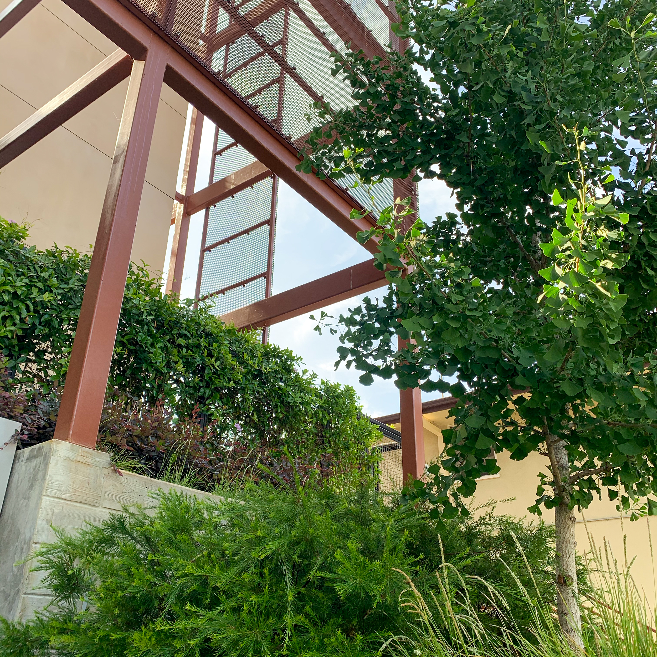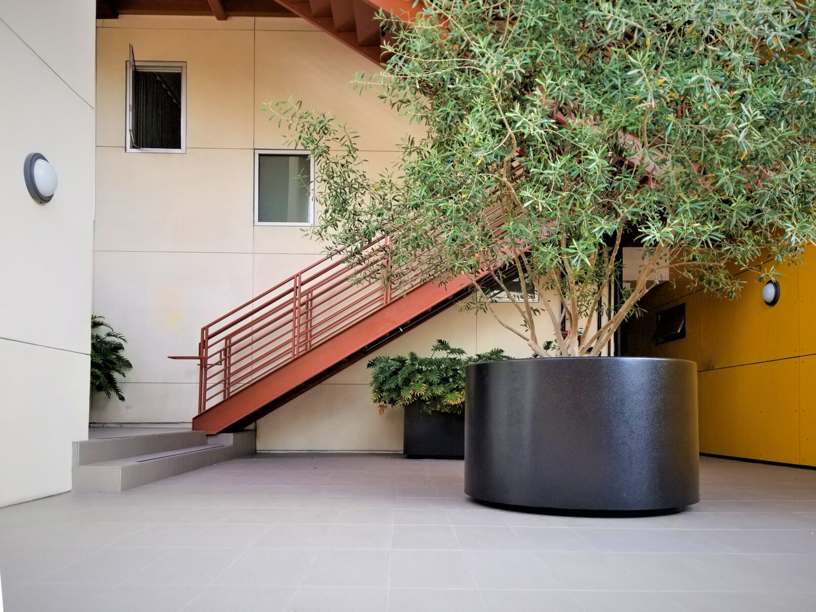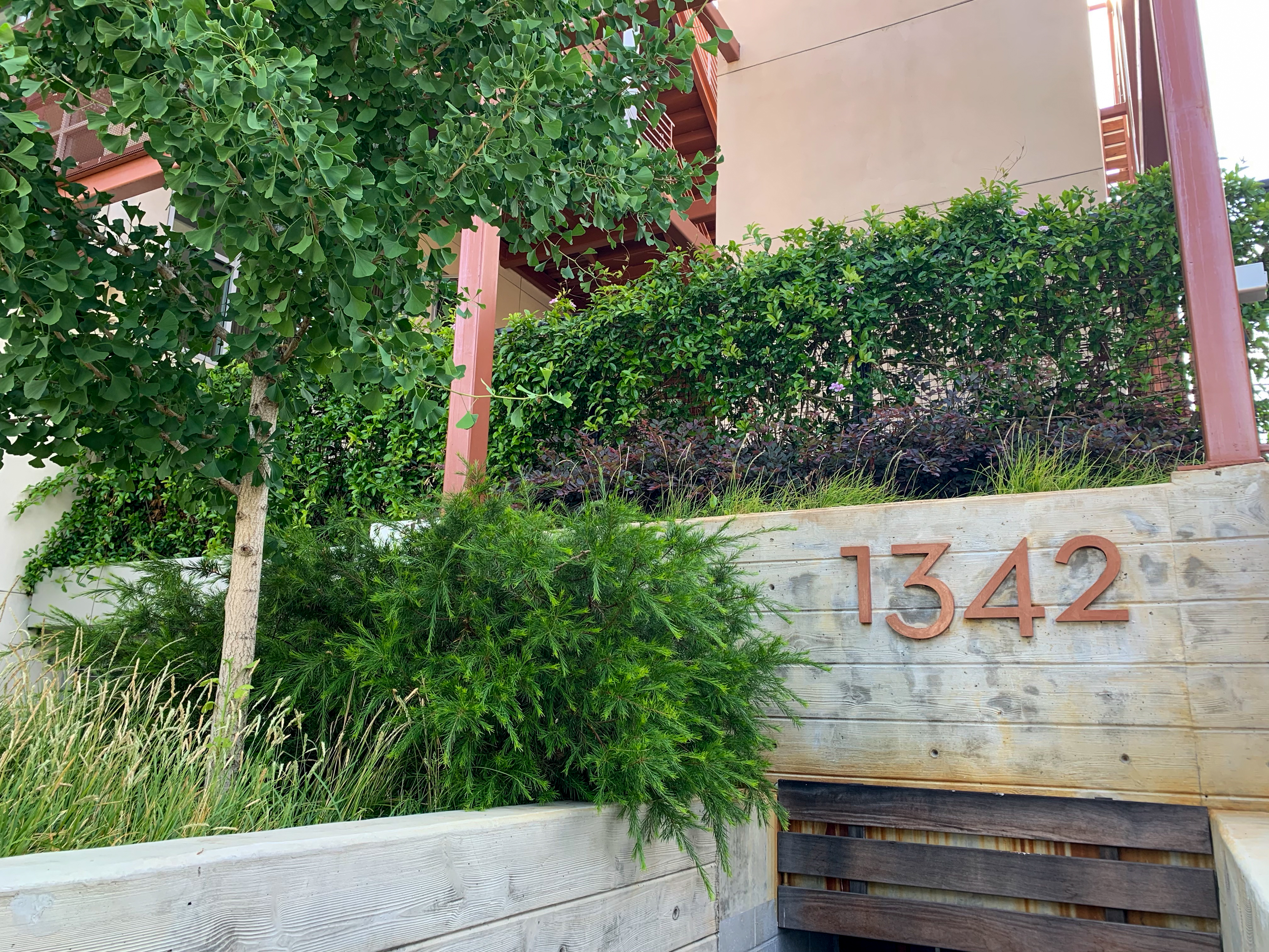 Hayworth Townhomes, located in vibrant urban West Hollywood, offers 16 beautifully designed residences. Lush landscaping with a variety of plants, grasses, and trees creates a striking contrast against the pops of yellow and red in the architecture.