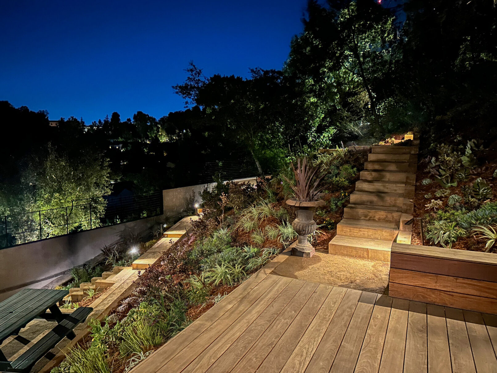 - Professional Lighting: Subtle, warm-toned landscape lighting highlights wooden steps, pathways, and mature specimen trees, ensuring safety while creating a dramatic nighttime ambiance.
