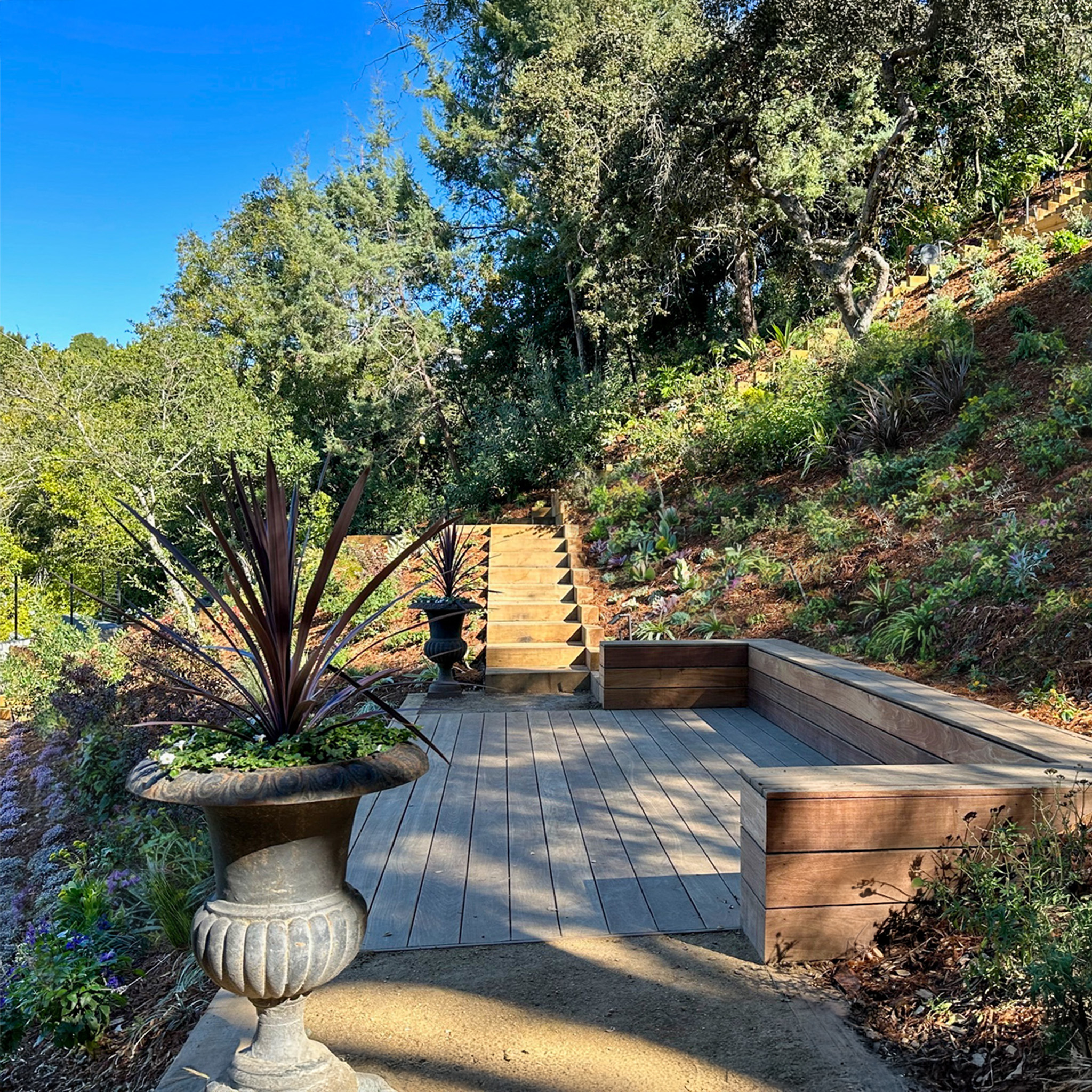 - Connectivity: Custom-crafted steep stairs and pathways allow for seamless navigation of the sloped terrain, maintaining an organic, harmonious aesthetic that feels connected to the natural hillside.