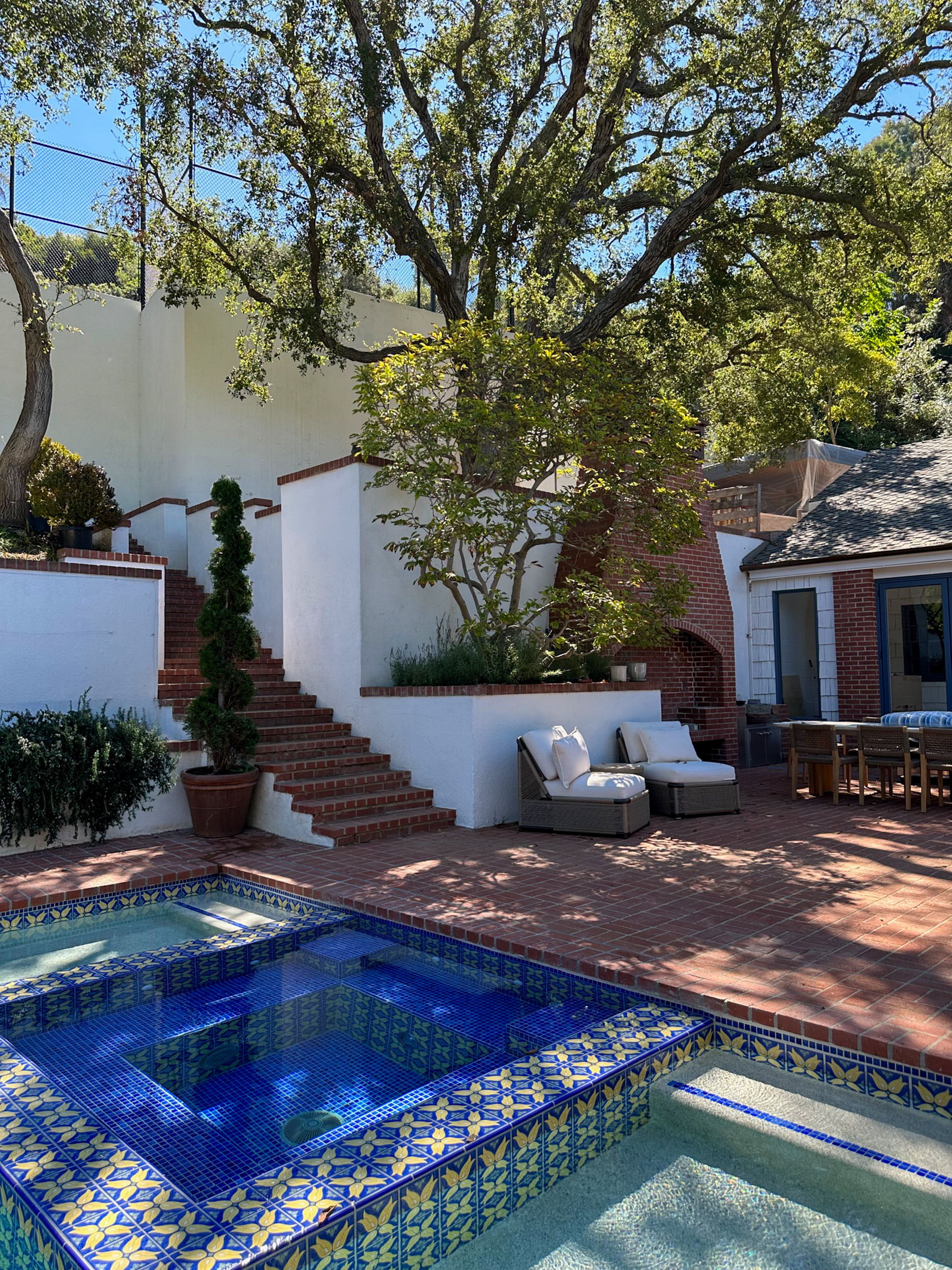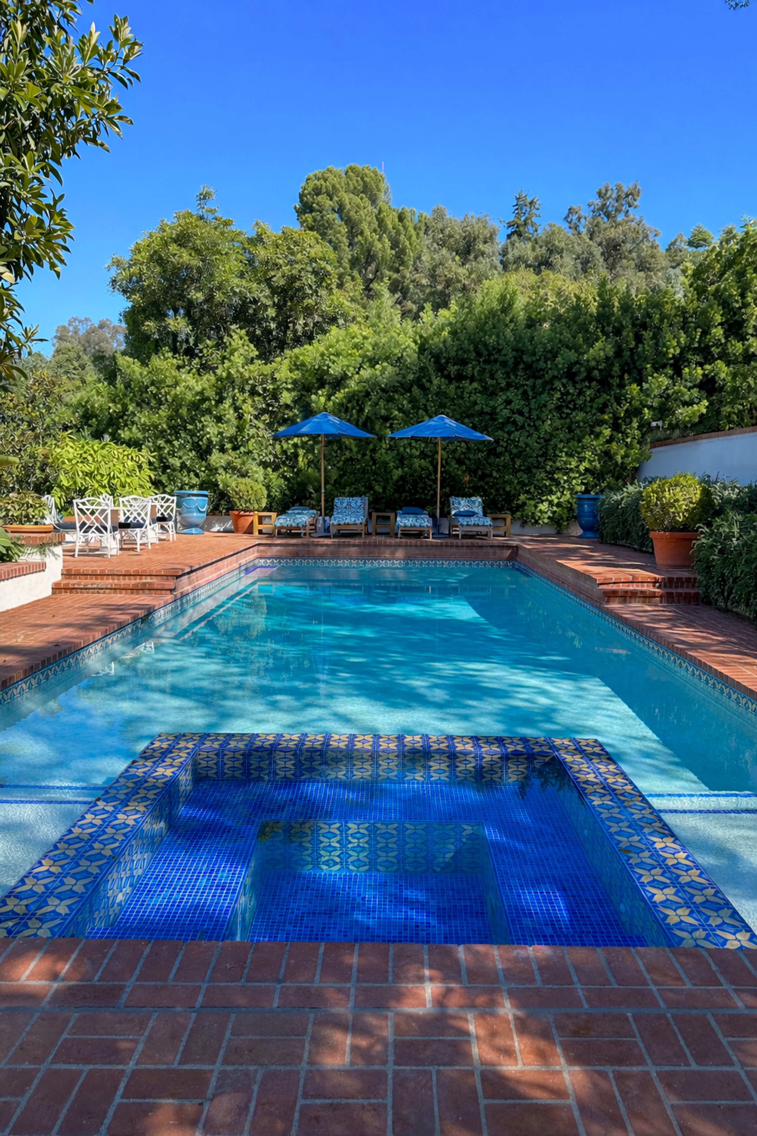 - Finishes: Homeowner utilized stone-like pool finishes and vibrant Spanish-style porcelain tiles to add depth and Mediterranean flair.